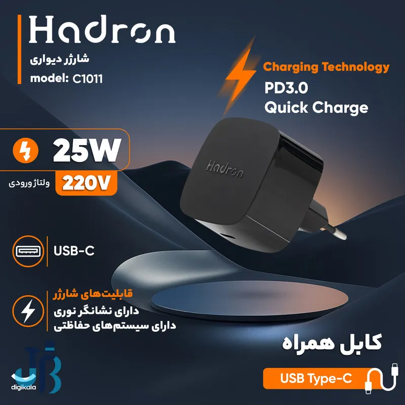 شارژر دیواری 25 وات هادرون مدل C1011 با توان 25 وات و تکنولوژی GaN. پشتیبانی از PPS (سوپر فست شارژ سامسونگ) و PD. ابعاد بسیار کوچک، ایمنی بالا و نشانگر LED هوشمند. ضمانت اصالت کالا در جانبی با من.